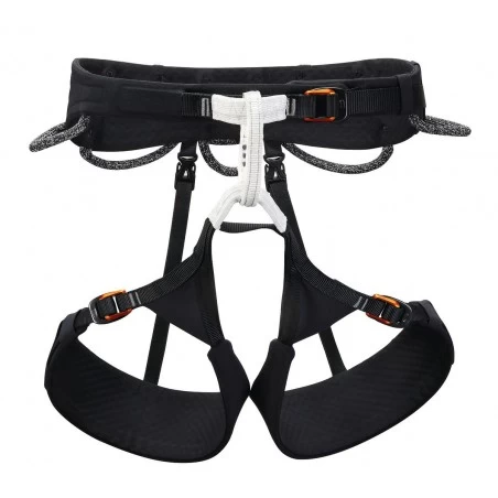 Il offre de bonnes possibilités de transport du matériel, avec notamment ses quatre porte matos. Les points d’encordement en polyéthylène haute ténacité améliorent la résistance aux frottements de la corde et renforcent la durabilité du harnais.